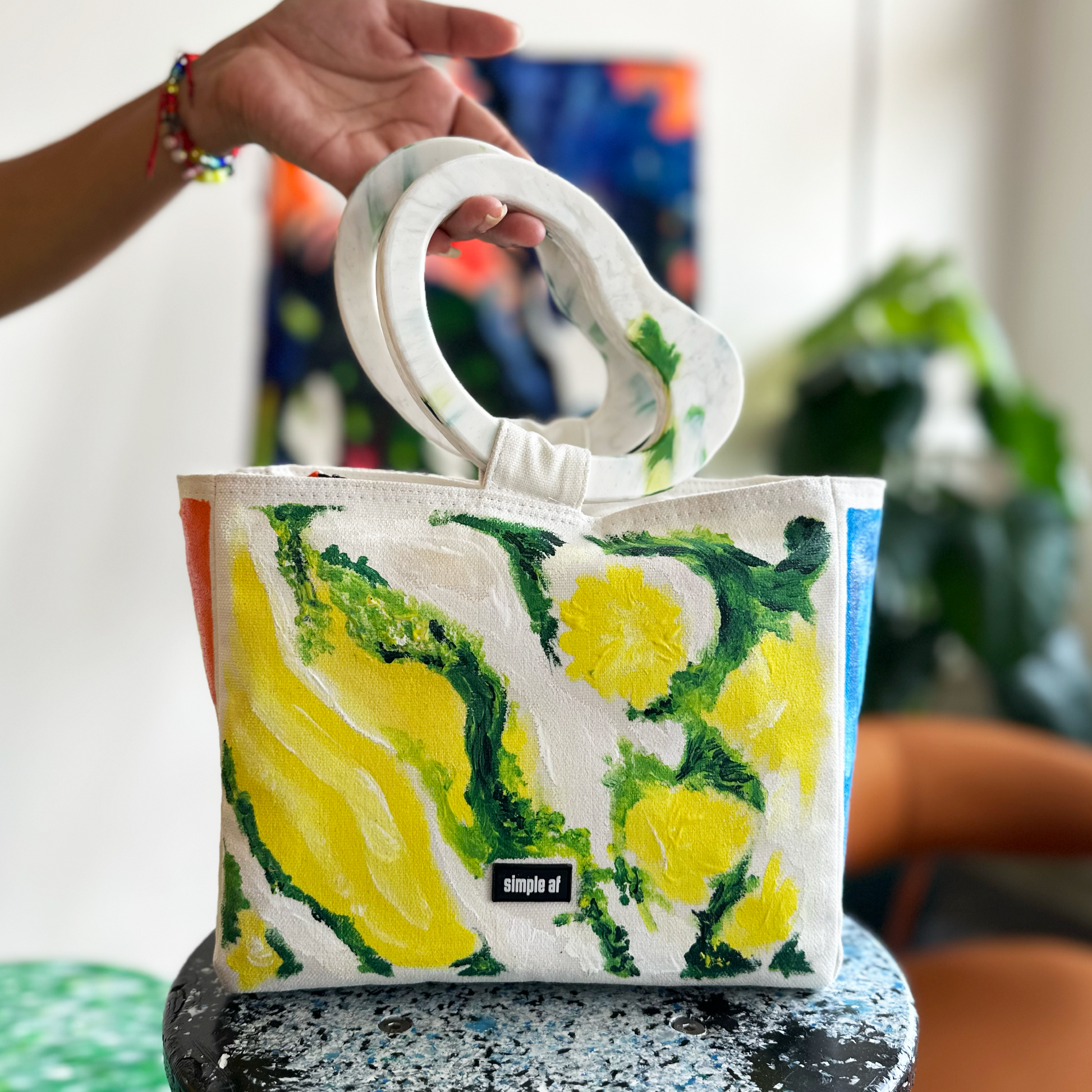 Cartera hecha de textil reciclado con manijas de plástico reciclado. Diseñadas y hechas en el taller de Simple AF con mano de obra 100% ética.